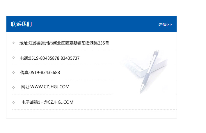 地址:常州市新北區友邦商務大廈1幢16、17層  電話:0519-85101652  傳真:0519-85112595  郵編:213022  網址:www_cz-jiayue_cn.wqjgroup.com  郵箱:xiajifengaa@163.com